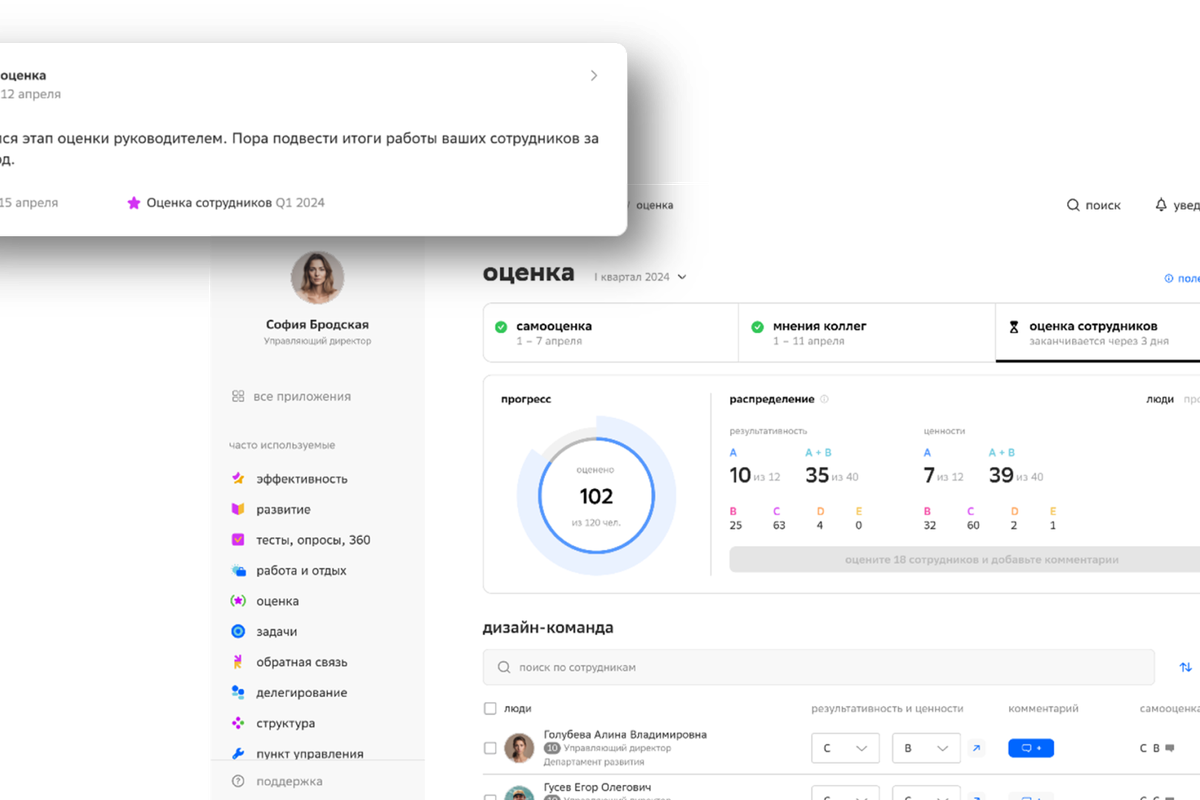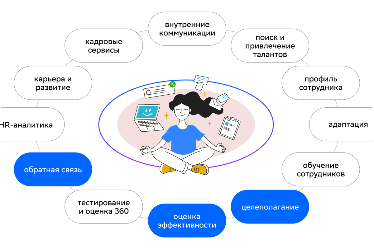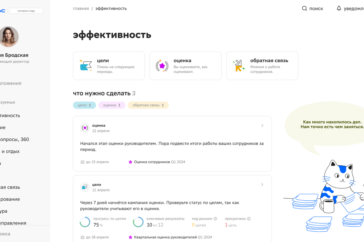 Инструмент выстраивает понятный и удобный пользовательский путь по циклу управления эффективностью, наполняет смыслами процессы и подсвечивает самое важное для каждого сотрудника.
