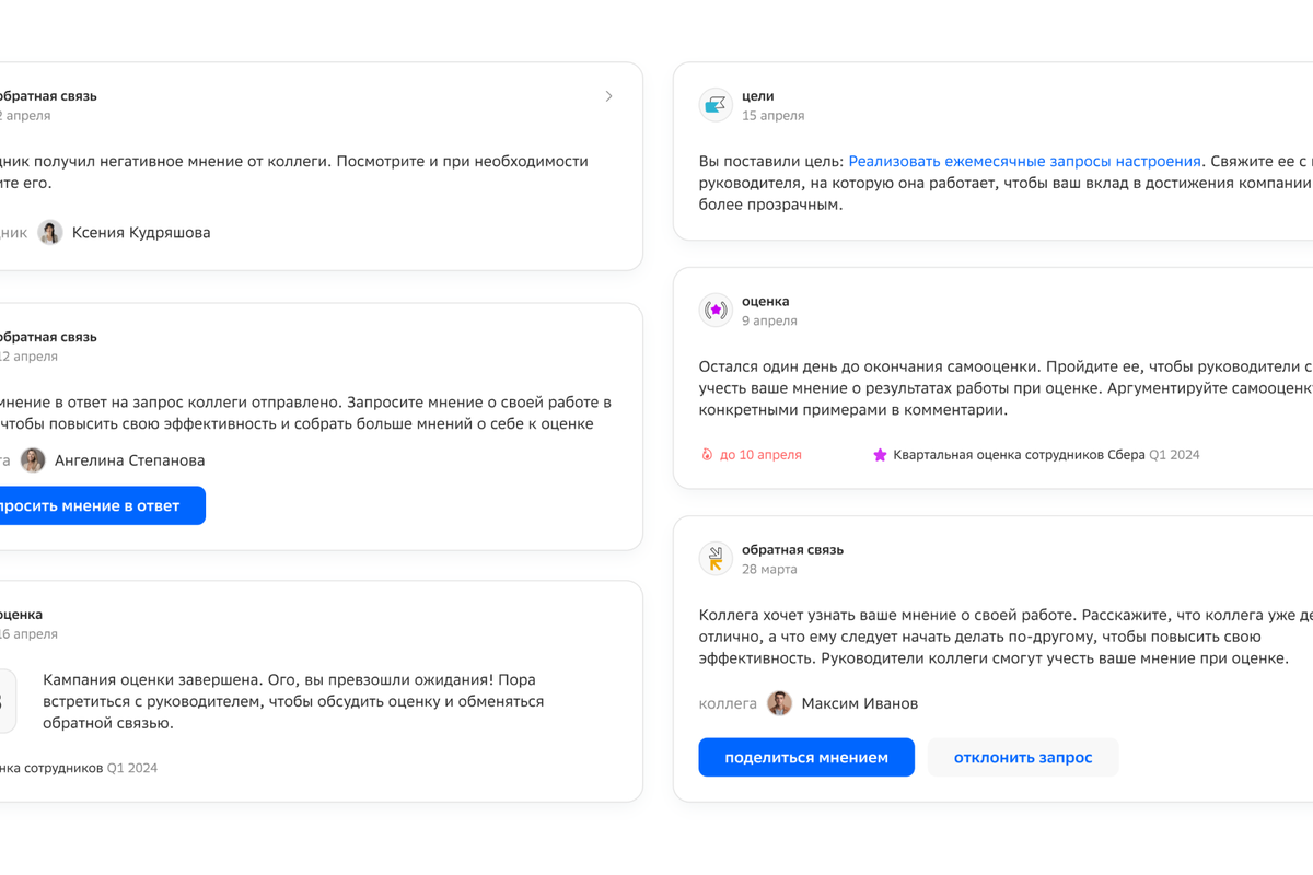 Задача новой разработки команды «Пульса» – выстроить понятный и удобный для пользователя путь по циклу, наполнить процессы смыслом и помочь повысить эффективность сотрудника Сбера и каждого из коммерческих клиентов «Пульса», а также направлять людей как можно чаще обмениваться обратной связью.