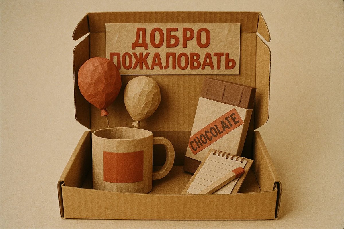 Welcome box. Красивая фирменная коробка. Внутри — корпоративная канцелярия (ручки, стикеры, скрепки, держатель), кружка (фирменная или просто радостная «жёлтая со смайлом»), что-нибудь вкусное — плитка шоколада, маленькая пачка чая. Когда для удалённых сотрудников курьер привозит коробку домой в первый день, это очень чёткий сигнал «мы тебя ждали».