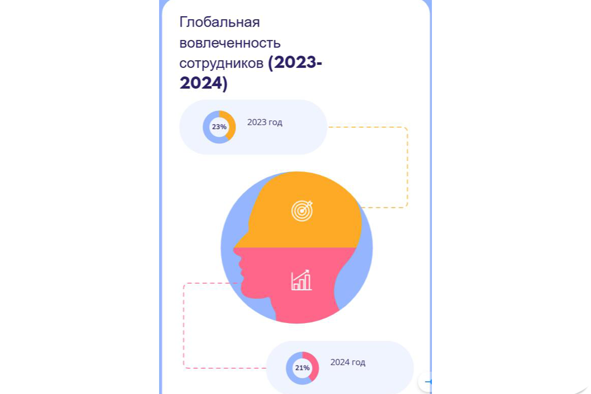 Кроме того, мы активно используем внутренние каналы коммуникации (мессенджеры, корпоративный портал), чтобы оперативно информировать сотрудников о важных событиях, изменениях в стратегии и новостях компании.