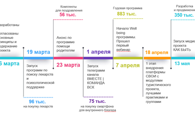 Так социальный проект «Забота на работе» стал развиваться одновременно в 4 направлениях: программа «Благополучие сотрудников ВСК», помощь родителям сотрудников, сервис для путешествий по России, «плюшки» от ВСК сотрудникам в формате ВСК-шерринг. В связи с мобилизацией, проект «Забота на работе» получил дополнительный вектор развития – помощь мобилизованным сотрудникам и их семьям.