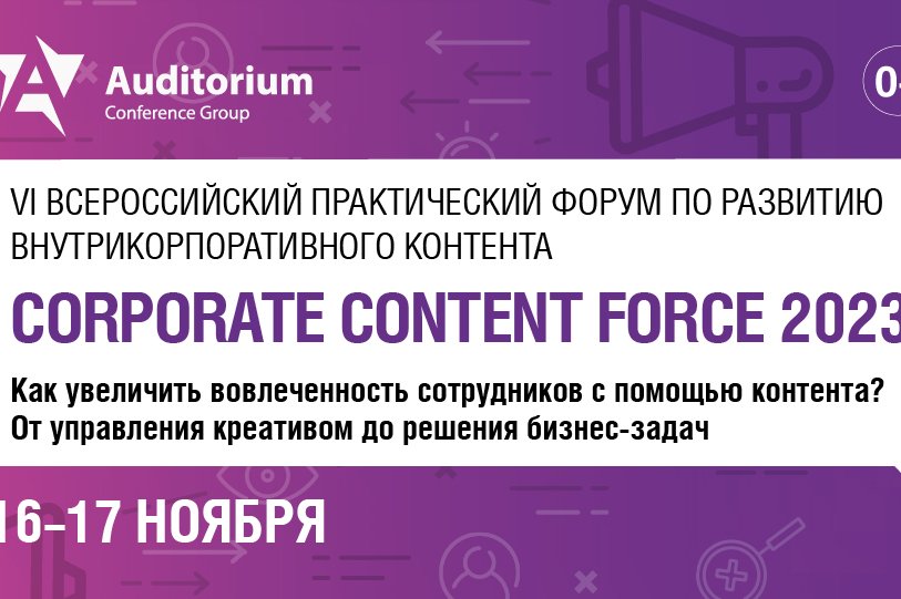 16 - 17 ноября 2023 года состоится VI Всероссийский практический форум по развитию внутрикорпоративного контента CORPORATE CONTENT FORCE 2023, посвященный увеличению вовлеченности сотрудников с помощью контента.