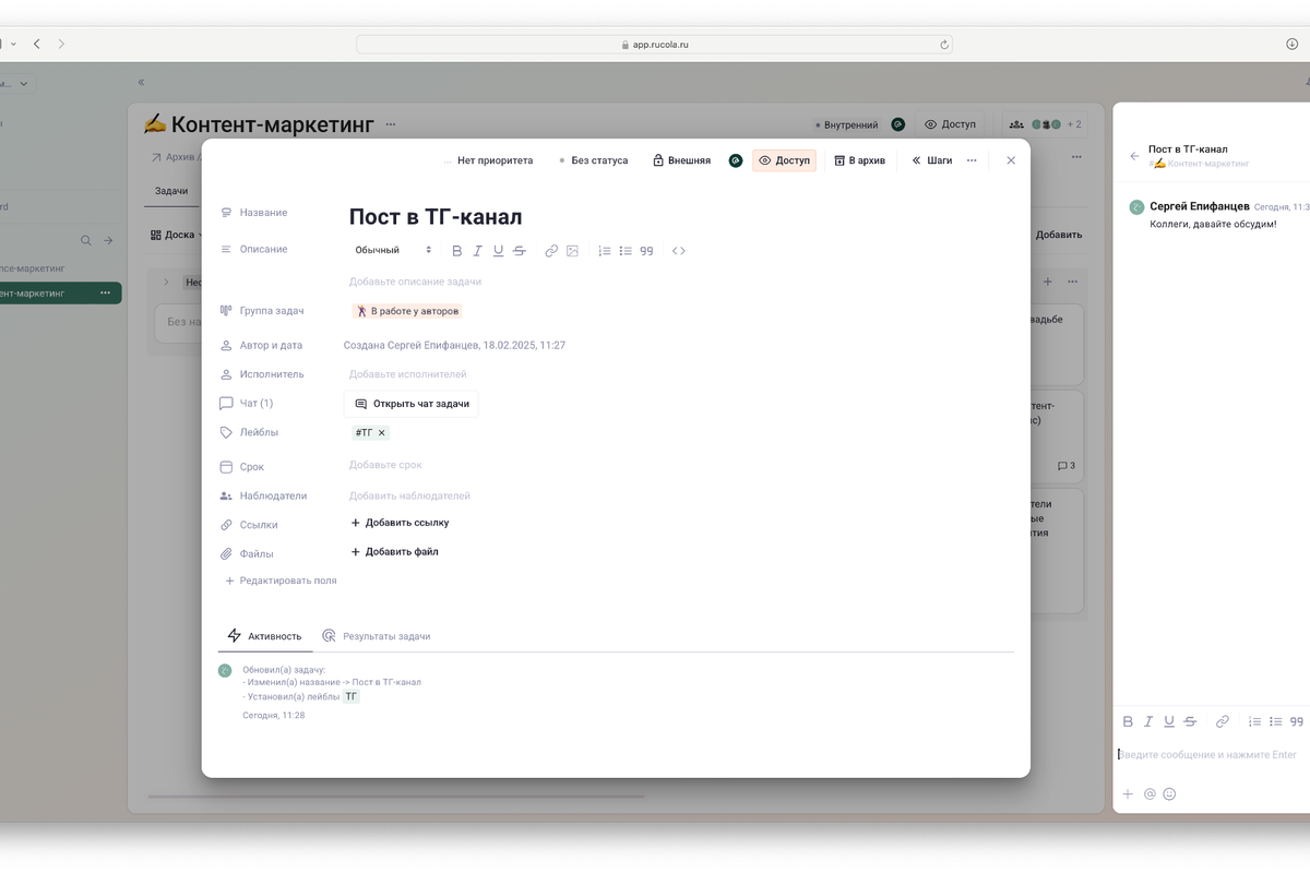 - Обсуждения можно прямо привязывать к задачам, поэтому все договоренности находятся в контексте — ничего не теряется, и не нужно гадать, где искать нужную информацию.