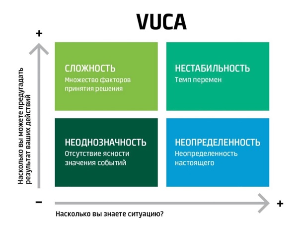 Условия современной нестабильности хорошо описываются аббревиатурой VUCA, которая расшифровывается как Volatility, Uncertainty, Complexity and Ambiguity (Нестабильность, Неопределенность, Сложность и Неоднозначность).