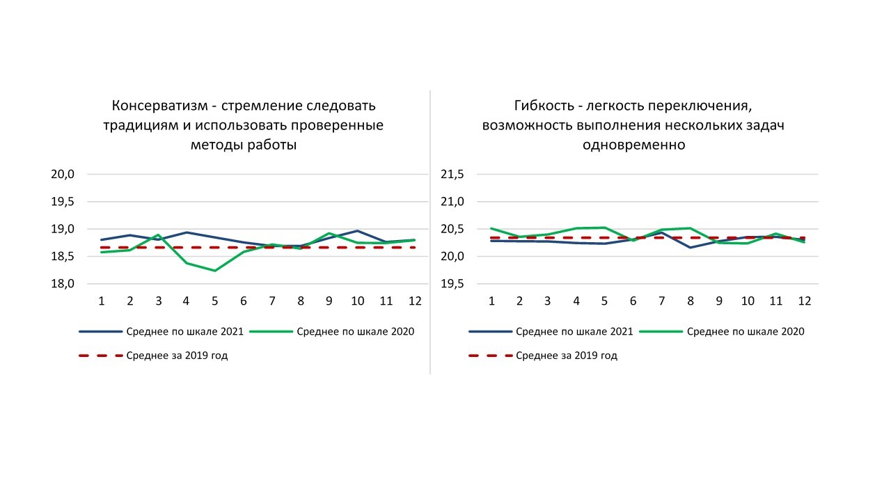Эти качества больше всего связаны с тем, как человек адаптируется к изменениям окружающего мира, насколько он может перестроиться в ситуации этих изменений, насколько может принять новые методы работы, реорганизовать привычные процессы. Мы ожидаем, что в ответ на изменение внешней ситуации показатели по этим параметрам продемонстрируют самые большие колебания: уровень консерватизма снизится, чтобы дать новому – привычкам, методам, способам работы – войти в жизнь. Гибкость же, наоборот, должна возрасти, чтобы помочь нам адаптироваться к ситуации изменений, лавировать в ней, как рыба в воде.