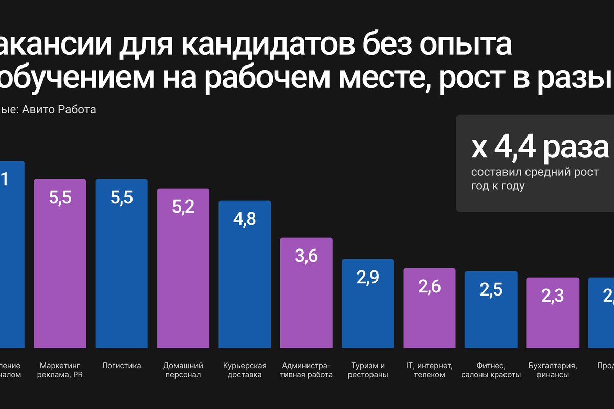 Сейчас на рынке стало в 4,4 раза больше вакансий для специалистов без опыта, но с последующим обучением на рабочем месте. Готовность учиться — это важное качество кандидата.