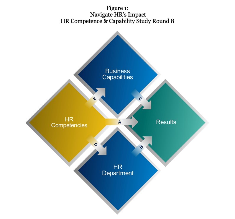 - Какие бизнес-возможности следует создавать с помощью HR для достижения бизнес-результатов (C) и какие индивидуальные компетенции HR помогают реализовать бизнес-возможности (E)? Мы определили три элемента HR, которые помогают в достижении бизнес-целей, их мы можем назвать человеческими способностями.