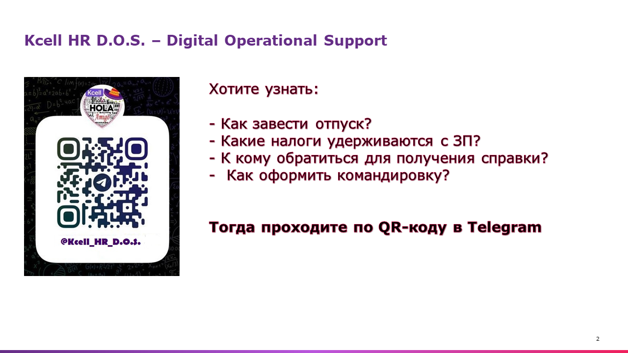 HR DOS – это доступный цифровой помощник в кармане каждого сотрудника компании Kcell. В нем можно оперативно получить ответ на вопросы по процессам компании. Бот высвободил рабочее время HR для решения других задач бизнеса.
