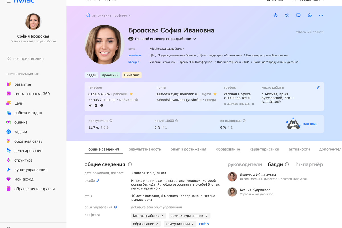 Профиль сотрудника в «Пульсе», основанный на синтетических данных, приближенных к реальности
