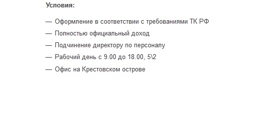 «Требования» (еще даже не работник, а уже что-то требуют); «Обязанности»; «Условия работы»; «О компании».