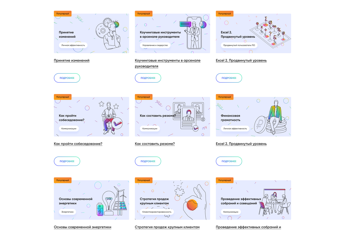 На портале представлено 20 проектов различной направленности: образовательные марафоны, целевое обучение, профориентация, карьерные треки, проекты подготовки к ОГЭ и ЕГЭ, программы практик и стажировок и многое другое. Также пользователям доступно более 50 бесплатных практико-ориентированных курсов разной тематики: от личной эффективности до профессионального обучения.