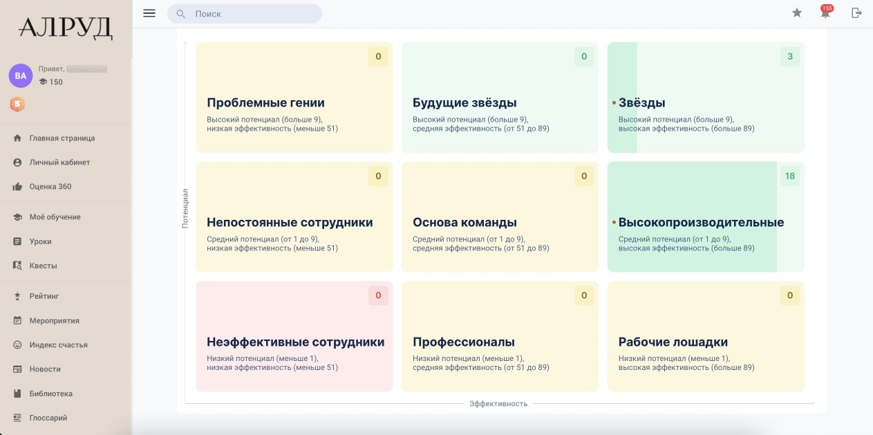 - построение матрицы талантов на основе достижений по ключевым показателям и уровню компетенций сотрудников.