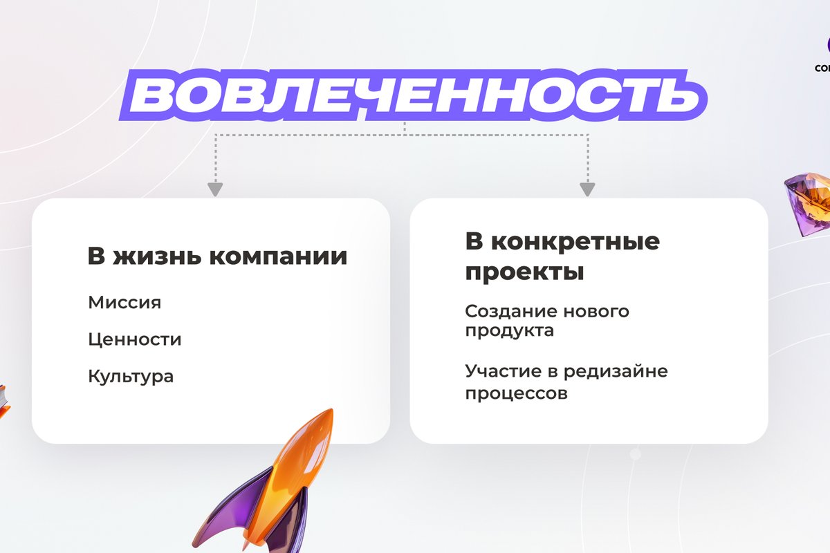 Когда взгляды сотрудника и компании совпадают, это создаёт дополнительную мотивацию и усиливает его вовлечённость. Приятно быть частью компании, продуктом которой ты гордишься, а идеологию искренне поддерживаешь. Если же ценности не совпадают, это может стать причиной внутреннего дискомфорта, который напрямую влияет на продуктивность в работе.