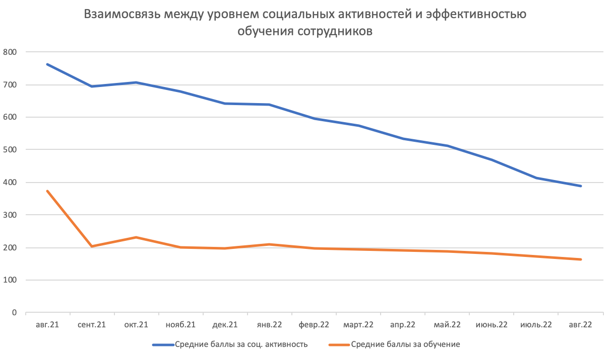 Удалось обнаружить взаимосвязь между уровнем социальной активности и эффективностью обучения сотрудников, что было доказано: