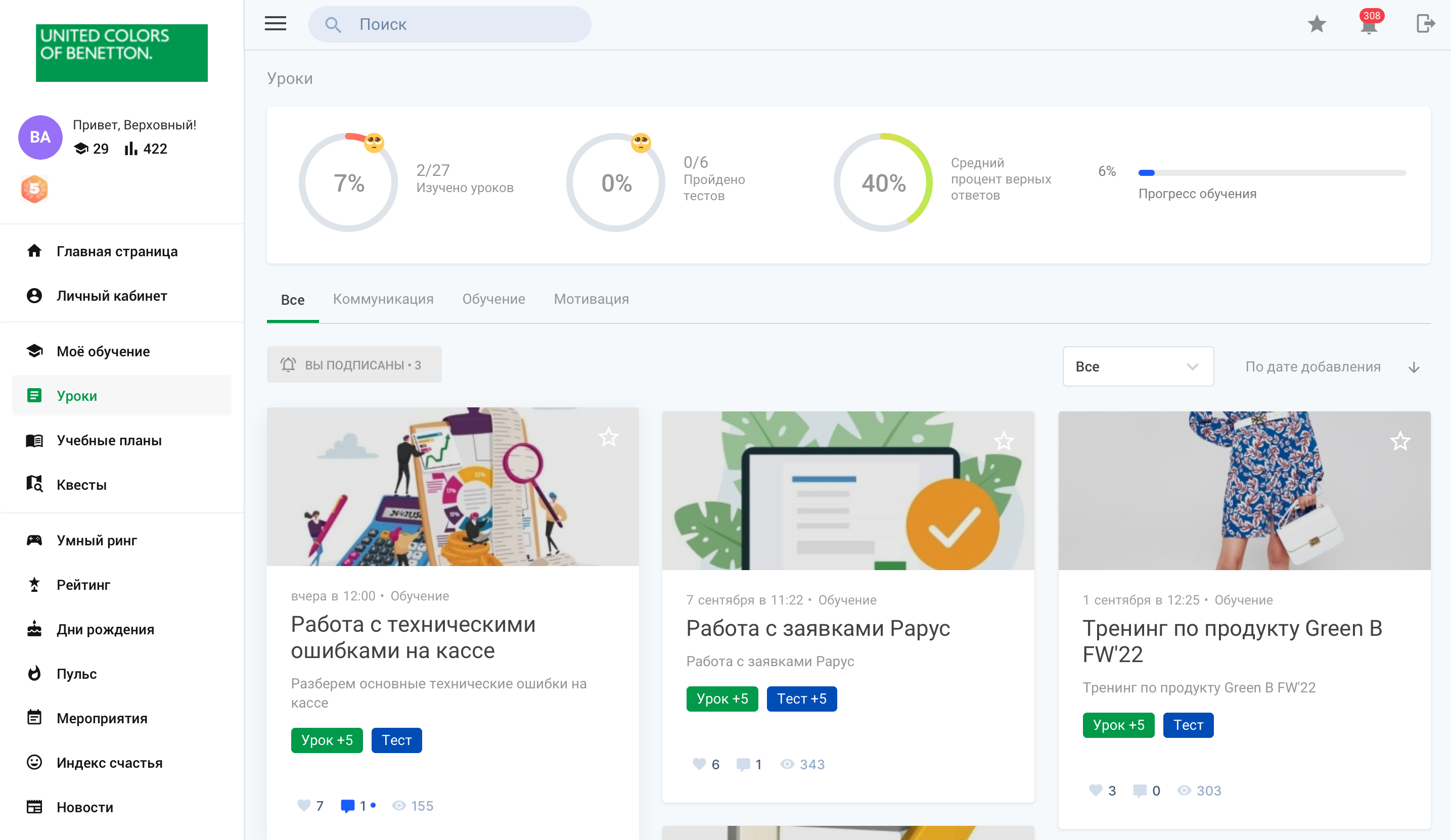 Помимо «Учебных планов» сразу же после регистрации на платформе новичкам назначается «Квест» о ценностях United Colors of Benetton, чтобы эмоционально вовлечь новых сотрудников в атмосферу компании. К концу адаптации новички не только понимают, как организована работа, но и погружаются в корпоративную культуру.