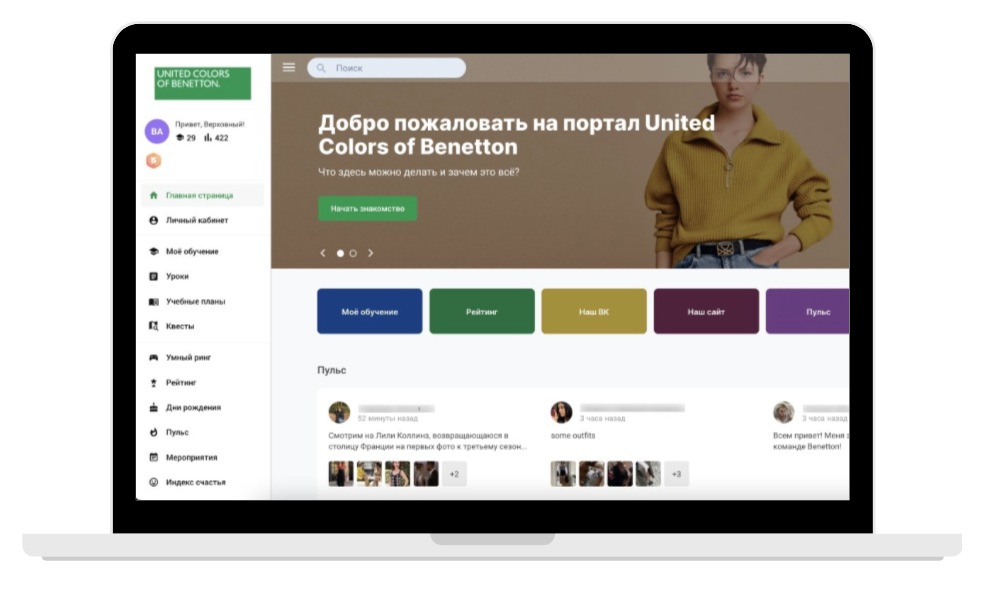 Внедренный проект позволил Benetton значительно сократить расходы на печатные материалы. Оказалось, что деньги, которые компания тратила на распечатку учебных материалов — это весь бюджет платформы . Конечно, полезнее и интереснее иметь целый коммуникационный и обучающий портал, чем печатать материалы.
