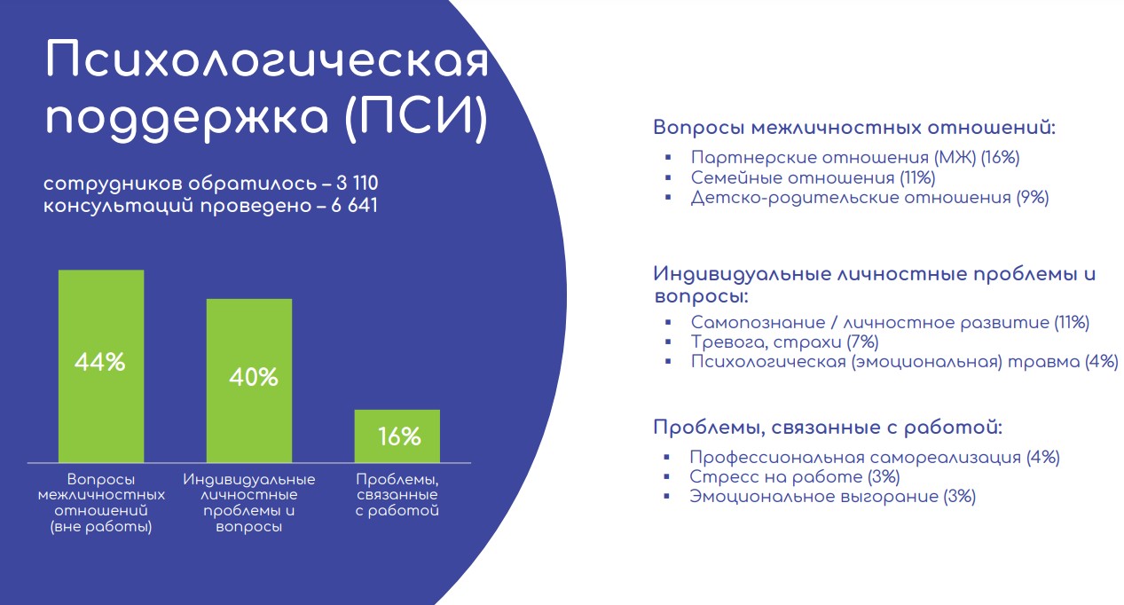 Сбер обратился с запросом на организацию психологической поддержки сотрудников согласно стратегии well-being, которая была разработана и согласована в банке. Стратегия включала в себя все аспекты благополучия человека, включая ментальное здоровье. После этого было принято решение включить психологическую поддержку в программу ДМС.