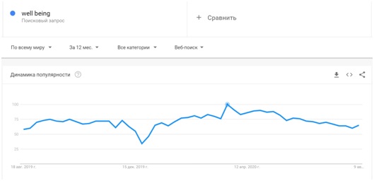 Во время острого периода пандемии забота о психологическом и физическом состоянии человека стала актуальна, как никогда раньше. Что касается специфического узкого запроса о концепции well-being, то, судя по аналитике Google trends, в апреле пользователи вбивали в строку поиска это словосочетание в два раза чаще, чем в январе.