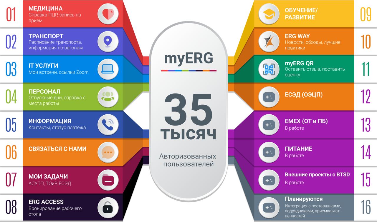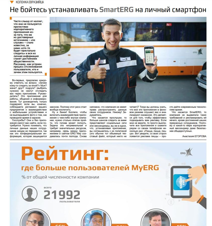 Smart ERG – это цифровой помощник для сотрудников компании ERG (Евразийская Группа), способствующий решению запросов в кратчайшие сроки без бумажных рутинных операций или личных обращений. Цель проекта – создание и поддержание позитивного опыта сотрудников группы на всех этапах развития в организации с помощью доступа 24/7 ко всем сервисам и единому коммуникационному пространству в смартфоне.