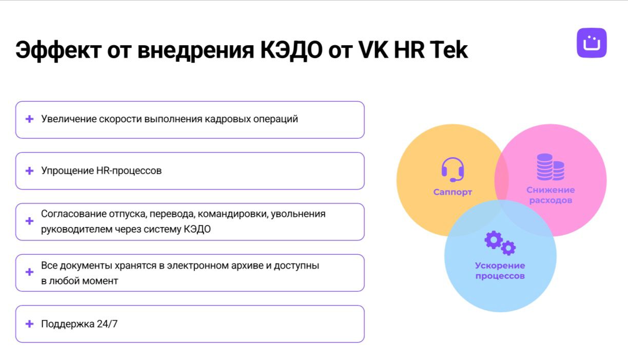 Никто не любит возиться с бумажными документами: печатать, подписывать, передавать в отдел кадров и так далее. Для экономии времени компании могут использовать технологии электронного документооборота. Это поможет быстрее и удобнее подписывать практически любые кадровые документы – по отпускам, переводам, командировкам и другим HR-процессам. Так, при переходе на КЭДО — VK HR Tek — скорость проведения операции специалиста отдела кадров с помощью электронного документооборота сокращается в среднем на 80% по сравнению с бумажным форматом.