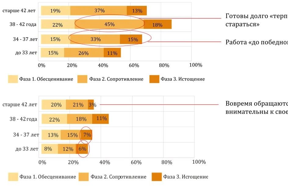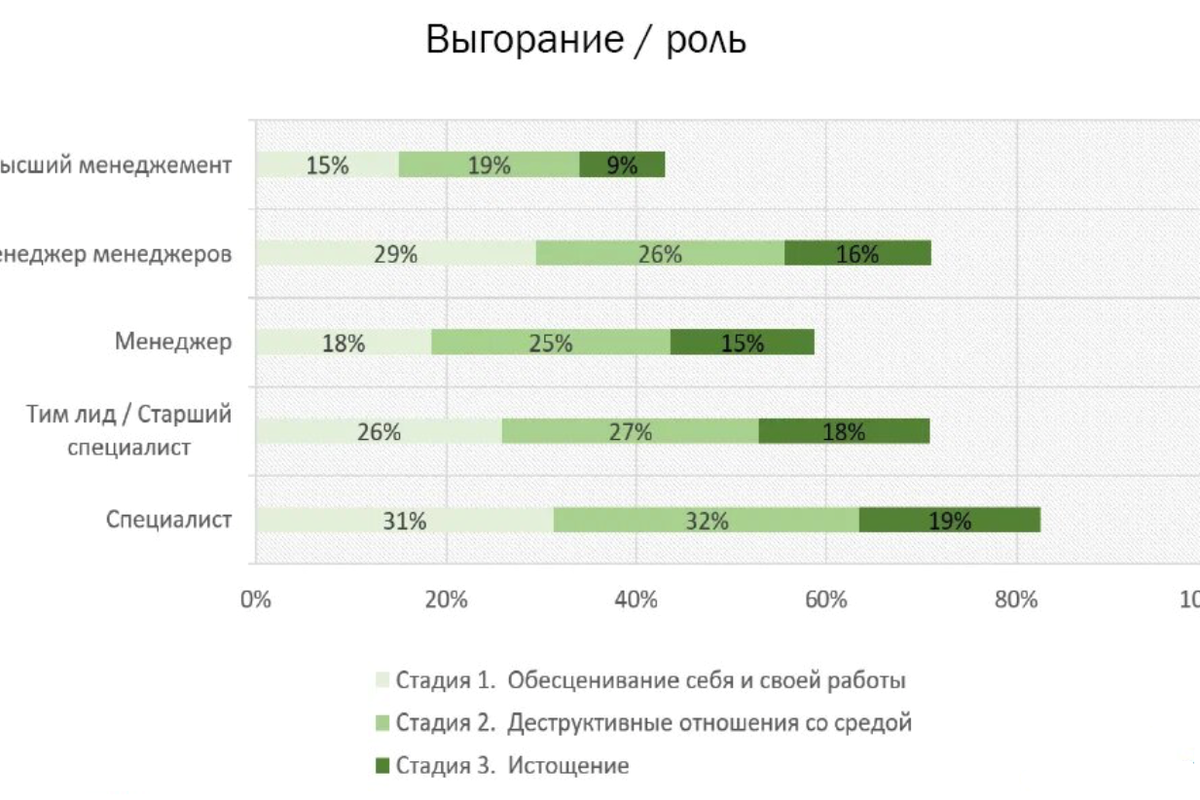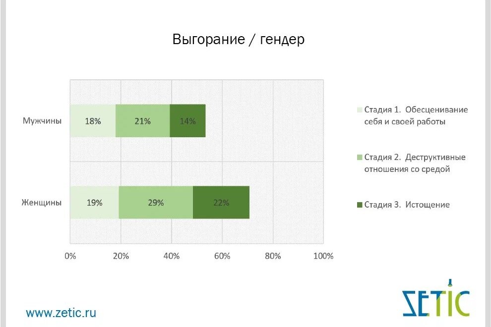 В 2020 году мы запустили большой исследовательский проект: с командой клинических психологов мы опросили 2500 участников от 16 до 55 лет — сотрудников и руководителей иностранных и российских компаний, находящихся в разных городах России. Оказалось, что у каждого второго (49%) сотрудника 20-45 лет есть маркеры выгорания. Женщины ему подвержены чаще мужчин — в силу особенностей нервной системы. Причем начальная стадия, на которой человек начинает обесценивать свою работу, проявляется у обоих полов с одинаковой частотой.