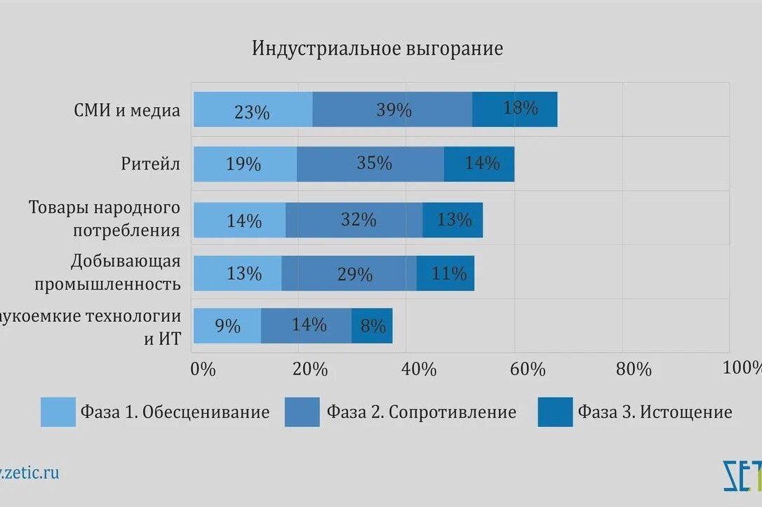 Также некоторые индустрии двигаются в настолько быстром и напряженном ритме, что сотрудникам принципиально важно разделять эту культуру, быть готовыми к постоянной смене целей, к выполнению огромных объемов работы в короткие сроки и даже к ощущению порой бессмысленной деятельности — нет понимания, зачем и кому это надо. И этим характеризуются самые «выгорательные» индустрии: СМИ, медиа, розничная торговля.