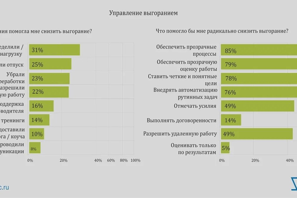 Предотвратить выгорание в российских компаниях невозможно, но можно не дать ему развиться до последней стадии, сохранить эффективность и продуктивность сотрудников. Здесь бизнес часто совершает ошибку — начинает работать точечно: сотрудник устал — его отправляют в отпуск (как делают 25% руководителей, по данным нашего исследования) или перераспределяют задачи (31% случаев). Еще руководители часто убирают переработки, разрешают уйти на удаленку.