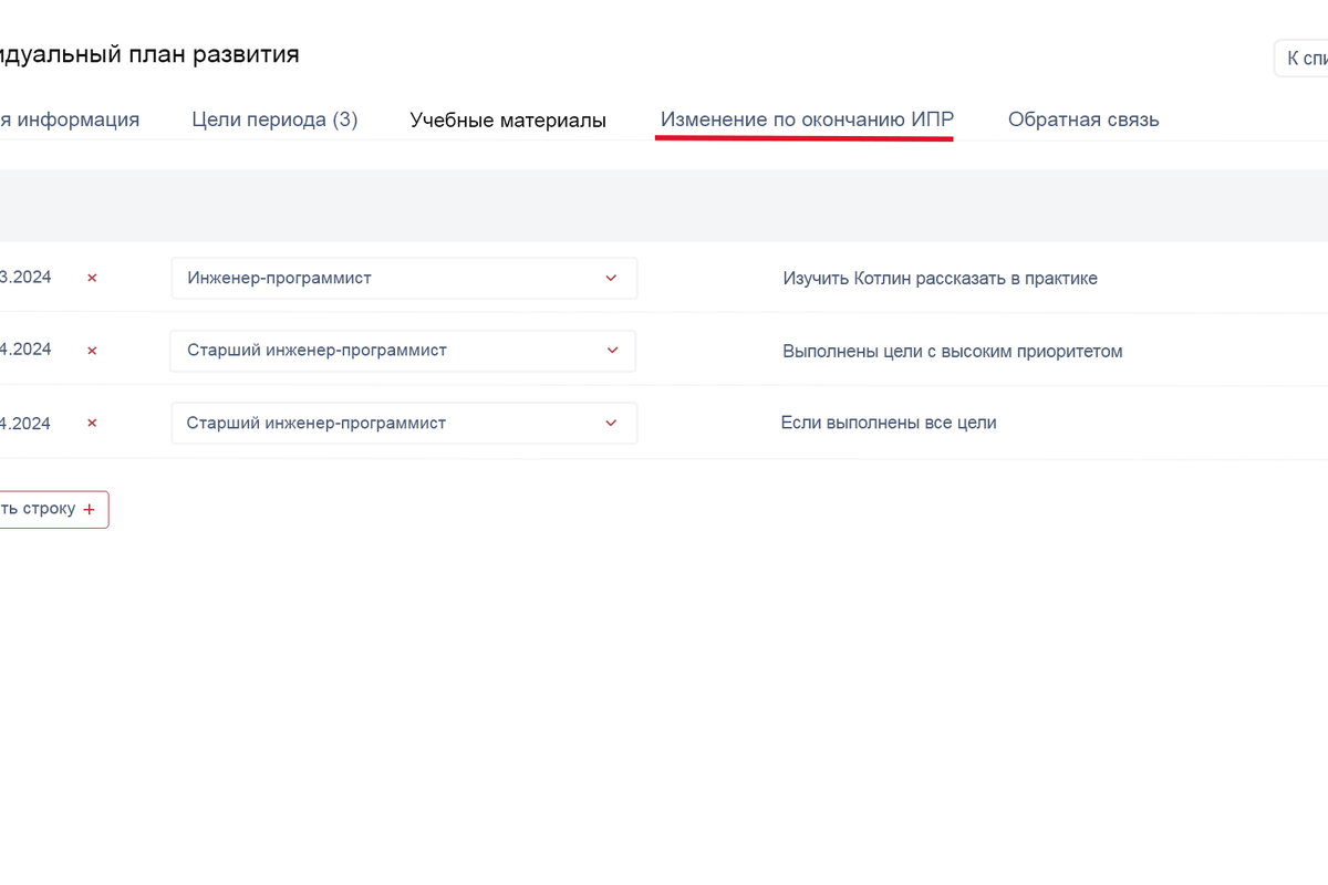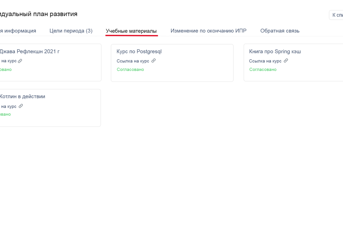 Помимо описания целей, план содержит учебные материалы и ссылки на них. Здесь отражается всё, что понадобится сотруднику из внешнего или внутреннего обучения – курсы, литература. У нас накоплена большая база внутренних курсов – от вебинаров по софт скиллс до обучения специфичным технологиям, которое может занимать до 6-9 месяцев. Но сотрудники могут выбрать и стороннее обучение или конференцию, если не найдут подходящий курс внутри. Прозрачность процесса и доступность самых разных образовательных опций мотивируют сотрудников пользоваться ИПР. Весь процесс полностью реализован в личном кабинете сотрудника на внутреннем портале, что очень удобно.