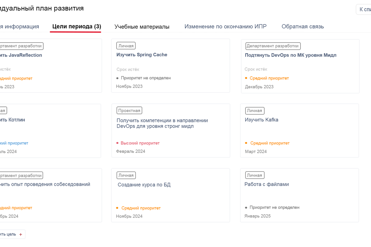 Так, мы составляем план, в котором у сотрудника цели разделены на личные, проектные и те, которые относятся к работе департамента, часть из них пересекается. У каждой цели есть срок выполнения и приоритет.