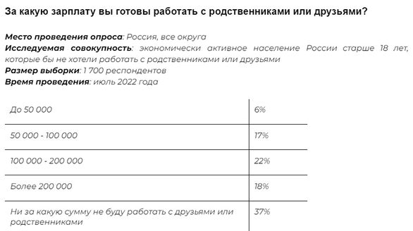 31% опрошенных россиян отметили, что не готовы работать с родственниками или друзьями ни за какую сумму. 22% готовы согласиться на это за зарплату от 100 000 до 200 000 рублей. 18% будет достаточно получать более 200 000 рублей. Работать с родственниками и друзьями за 50 000 — 100 000 рублей могли бы 17% респондентов, а за зарплату менее 50 000 рублей только 6%.