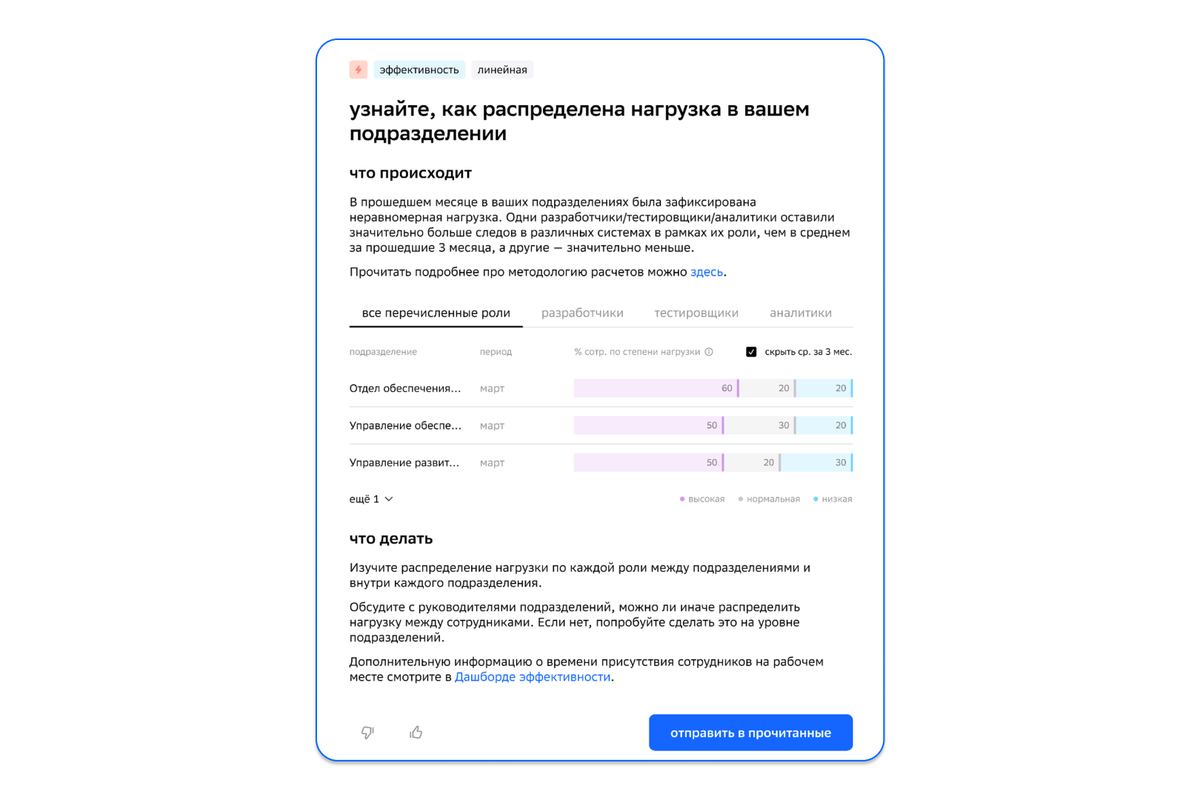 Пример инсайта по эффективности команды на HR-платформе «Пульс», основанного на синтетических данных, приближенных к реальности