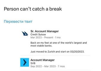 Что касается последнего места работы незадачливого служащего, то им оказался печально известный банк Credit Suisse, который обанкротился сразу после прогоревшего Silicon Valley Bank.