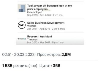 - Theranos — компания, обещавшая полную диагностику организма по капле крови. Эту компанию признали одной из крупнейших современных афер а ее основательницу Элизабет Холмс приговорили к 11 годам тюрьмы.